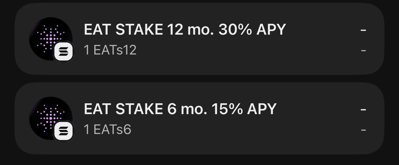The 6 and 12 month staking pool will expire at the end of 2027 while the 18 month pool will expire mid 2028. There will be no user facing fees other than Solana network fees. Staking tokens will appear like this in your wallet